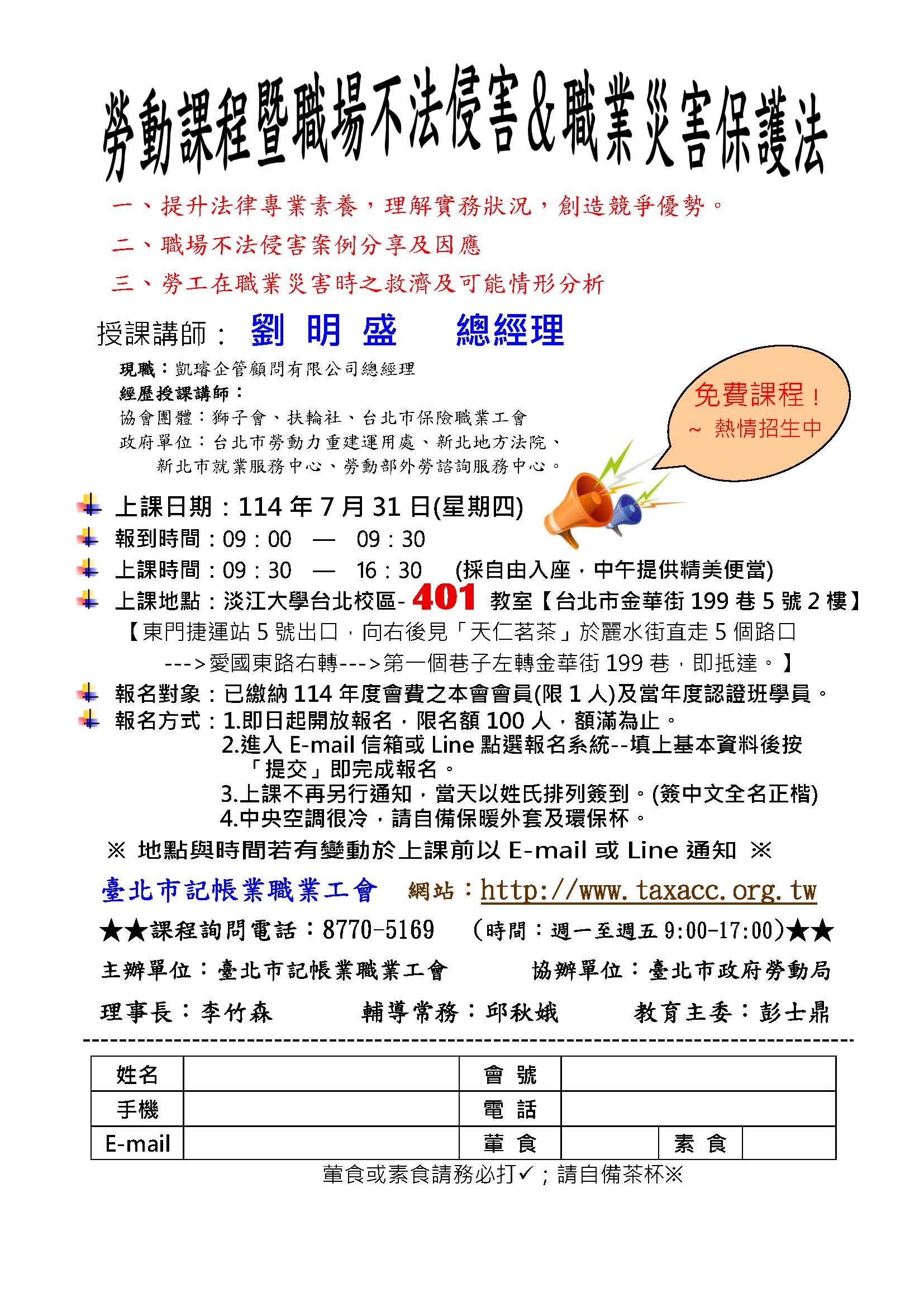 114年7月31日免費課程---劉明盛老師主講 『勞動課程暨職場不法侵害&職業災害保護法』