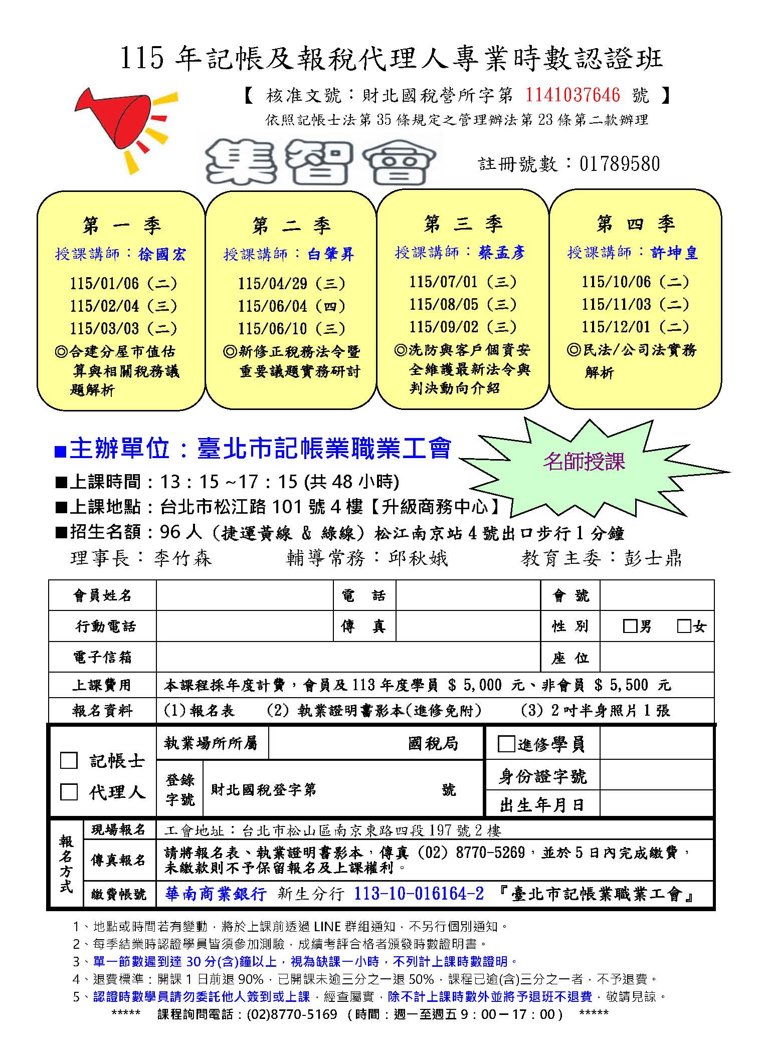 集智會115年度認證班開始報名了,有四位超強師資陣容【今年更有實務經驗豐富的律師課程內容】,名額有限。歡迎新生『代理人認證』 或『記帳士進修』及『員工教育訓練』都可以踴躍報名,期待您的加入。請洽秘書處 報名電話:87705169
