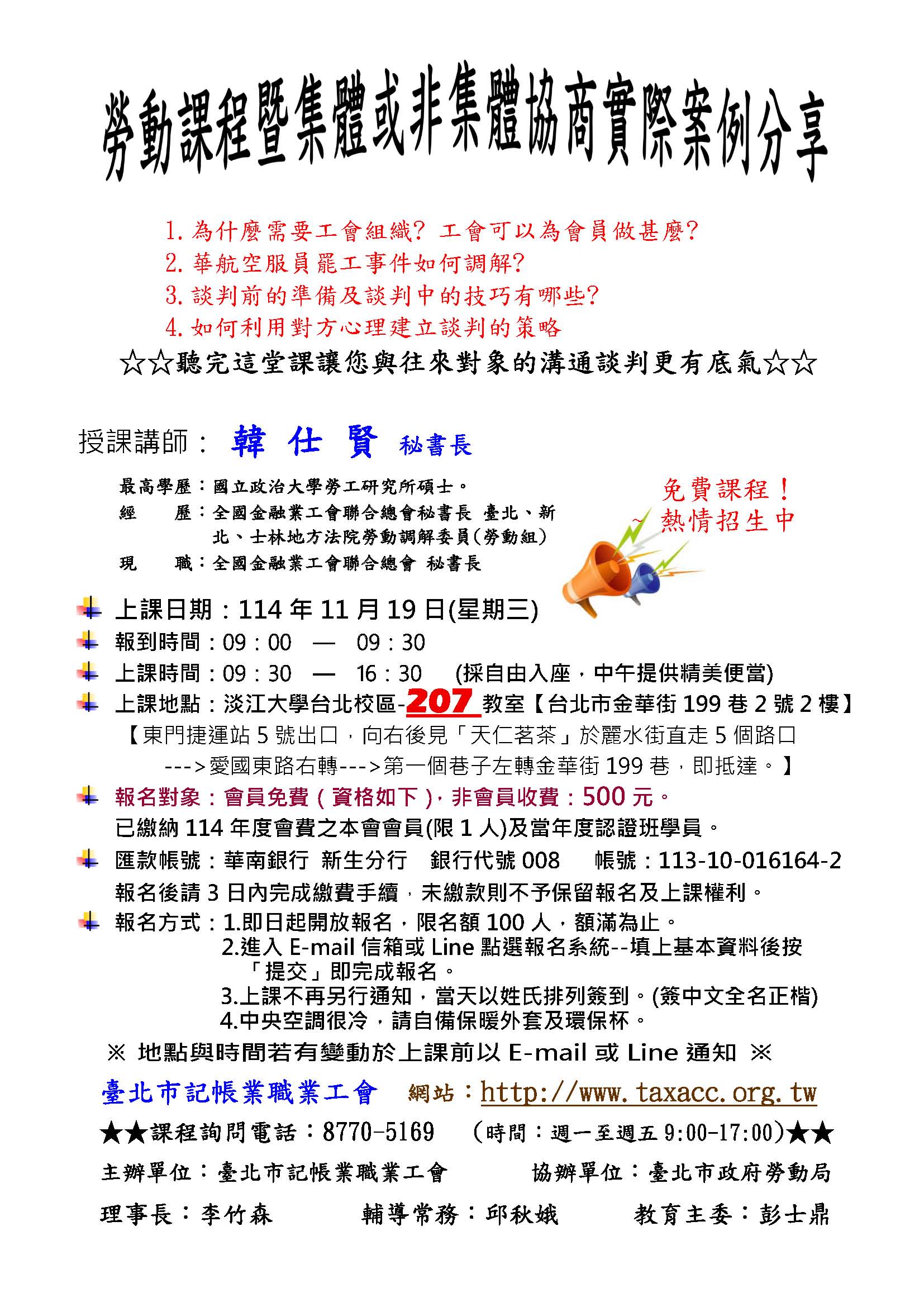 114年11月19日免費課程---韓仕賢老師主講 『勞動課程暨集體或非集體協商實際案例分享』
